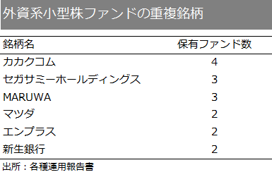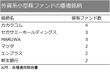 さて、こうした状況を踏まえて、外資系運用会社の7つの小型株ファンドの上位10をリストし、さらにその中で異なるファンドで保有されている銘柄をピックアップしました。不思議なことに、いくつかの銘柄は複数のファンドで上位10にいるということが分かります。これを銘柄調査のきっかけにするというのは、インテリジェンスのひとつです。