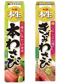 左が、原材料のわさびを本わさび100%とした「本生 本わさび」。サメ皮ですりおろしたようなきめ細かいなめらかさ、清涼感のある風味、辛みが特徴。右は現在発売中の「本生きざみわさび」。控えめな辛さと茎わさびのシャキシャキとした食感が味わえる。