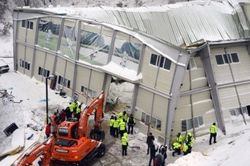 雪で屋根が潰れた体育館