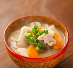 豚汁。味噌、豚肉、そして具だくさんの野菜が味を引き立たせる。