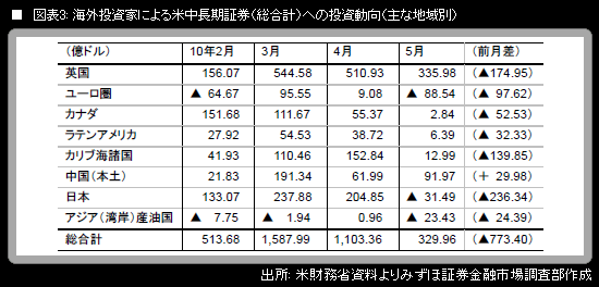 5月は、ギリシャの財政危機が、その他南欧諸国も巻き込んだユーロ圏の信用不安問題へと拡大。欧州連合(EU)・国際通貨基金(IMF)が7500億ユーロの緊急資金支援枠の創設に動いたほか、欧州中央銀行(ECB)がユーロ圏諸国発行の国債買い入れを開始、ドイツが単独でユーロ圏国債などの空売り規制を導入するといった、激動の月だった。欧州通貨統合というシステムへの信認が低下する中で、同時に、ユーロ圏は財政緊縮強化を選択する代わりにユーロ安を容認するだろうという市場の読みのもと、ユーロは対ドルで、月初の1ユーロ=1.32ドル台から、中旬には1.21ドル台へと急落した。こうした為替相場の動きが示すように、5月も、ユーロ建て資産からドル建て資産へと、投資マネーのシフトがグローバルに継続して行われた可能性が高い。今回明らかになった5月分を含む直近数カ月の米財務省統計の内容は、そうした見方を補強する。