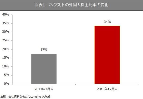 Longine IR:株式投資はグローバル化して久しいですが、不動産というカテゴリーもグローバル化した金融商品の一つです。世界の株式投資家も不動産に関係する企業への注目度は高くなります。外国法人によるネクスト株の保有比率は2013年3月末と2013年12月末を比較すると9か月の間に倍増しています。結果として、外国人投資家による保有比率は個人投資家保有比率42%(内、井上高志社長が37%を保有)に次ぐ34%にまで拡大しました。ここまで海外の株式投資家がネクスト株に注目したのはなぜでしょうか。
