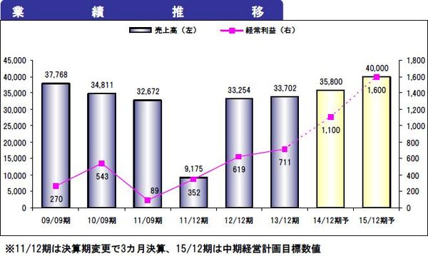 中期経営計画2年目の2014年12月期は、売上高が前期比6.2%増の35,800百万円、経常利益が同54.5%増の1,100百万円を見込む。期末店舗数は14店舗増の258店舗を計画し、既存店の堅調な売上高推移と新規出店効果で利益目標を達成する方針である。