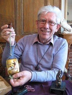 パリ在住のアラン・デュクロ氏。手にした紐の上部に付いているのが根付。いかに小さいかがよく分かる。デュクロ氏のペンダントヘッドも根付だ。右手前に見えるのは、国際根付ソサエティから授与された「シルバーキリンのトロフィー」(筆者撮影)