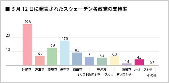 同党は2006年に設立された新興政党だが、現在は支持率4.3%を獲得し、すでに欧州議会の座席チケットを手にしたと言える*3。支持層の成長率だけで比較すれば、1月には1%だったのが、2月に2%弱、4月に3%、5月12日には4.3%と、極右・スウェーデン民主党をはるかに凌ぐスピードだ。