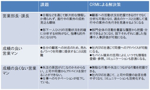 商談に関する情報の全てを蓄積しておけるため、売れない営業マンは、「なぜ売れないのか」という分析ができる。売れない営業マンの無駄な行動や時間の浪費が、可視化できるようになる。そこを是正するとともに、売れる営業マンのノウハウを共有しアドバイスを受けることで、成果が上がってくるし、本人の自信やモチベーションにもつながっていく。