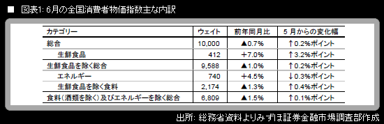 7月30日に総務省から発表された6月の全国消費者物価指数(全国CPI)は、「生鮮食品を除く総合」(コア)ベースで前年同月比▲1.0%。マイナス幅は前月から0.2%ポイント縮小した。コア前年同月比の押し上げには、「生鮮食品を除く食料」「電気代」「都市ガス代」「被服及び履物」などが寄与。一方、押し下げには、「ガソリン」「家賃」などが寄与した。