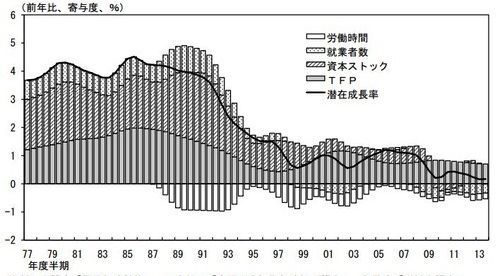 まず今までの実績を見てみよう。成長戦略の目標となる潜在成長率(実体経済の長期的成長力)は、推定モデルによって違うが、日銀の調べでは図1のように「ほぼゼロ」。IMF(国際通貨基金)も0.17%と推定している。アベノミクスの成果は、実体経済には出ていないようだ。