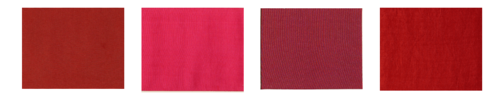 左から、赤色(色彩大鑑)・ 紅(同左)・蘇芳色(同左)・緋色(同左)