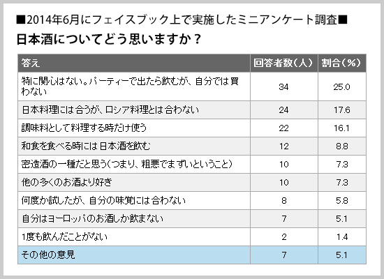 日本酒はロシア市場に食い込めるか 市野 ユーリア 著者フォロー フォロー中 2014.7.31(木) シェア80 Tweet 1 2 3 4 ギャラリーページへ まず、「1度も日本酒を試したことがない」と答えたのはたった2人、率にして回答者の1.4%だけだった。これだけで、もう朗報だ。日本酒はロシア人にとって何か「未知 残り2405文字 ここからは、JBpress Premium 限定です。 会員ログイン JBpress Premiumを無料で試す 初月無料 税込550円/月 全記事読み放題! カンタン登録!続けて記事をお読みください。詳細はこちら Premium会員に人気の記事 【自民党総裁選】小泉純一郎はルール変更追い風に初勝利、強者・権力者が「ゴールポスト」を動かした歴史 参政党の演説に在日コリアン3世の私が共感してしまった理由 AIが「働きたくても働けない人」と「働かなくてもいい人」を生成し始めた シェア80 Tweet ロシア バックナンバー 一覧 なぜロシア・ルーブルは対ドルで高止まりしているのか?戦費を確保するために外貨預金を取り崩すロシア政府 安木 新一郎 中国人のビザなし入国を容認したロシア、狙いは観光客が落とす人民元?中国人の誘致に熱を上げるロシアの腹づもり 土田 陽介 プーチンとトランプの両者に顔が利く「サハリンの石炭王」、ロシア産石炭の苦境に活路を見いだせるか? 安木 新一郎 「ウクライナの次」の標的は小国モルドバ、プーチンが仕掛けるハイブリッド戦争、偽情報と買収で大々的に選挙介入 木村 正人 ルーブルはどこまで海外で通用するのか?ロシア人観光客が押し寄せるタイの両替事情から推察する交換可能性と購買力 土田 陽介 高校生動員して量産するドローンでウクライナを凌駕しだしたロシア、合板と発泡スチロール製の「おとりドローン」も 木村 正人 フォロー機能について フォロー機能とは、指定した著者の新着記事の通知を受け取れる機能です。 フォローした著者の新着記事があるとヘッダー(ページ上部)のフォロー記事アイコンに赤丸で通知されます。 フォローした著者の一覧はマイページで確認できます。 ※フォロー機能は無料会員と有料会員の方のみ使用可能な機能です。 設定方法 記事ページのタイトル下にある「フォローする」アイコンをクリックするとその記事の著者をフォローできます。 確認方法 フォロー中の著者を確認したい場合、ヘッダーのマイページアイコンからマイページを開くことで確認できます。 解除方法 フォローを解除する際は、マイページのフォロー中の著者一覧から「フォロー中」アイコンをクリック、または解除したい著者の記事を開き、タイトル下にある「フォロー中」アイコンをクリックすることで解除できます。 ご登録 ログイン