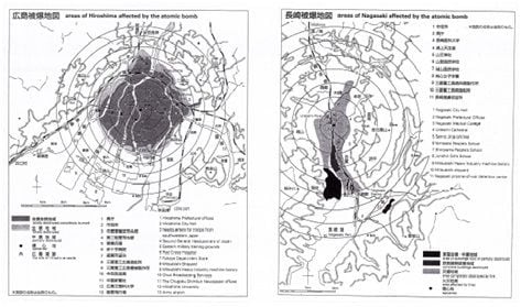 広島の状況(左)と長崎の状況(右)(原爆写真「ノーモア ヒロシマ・ナガサキ」から)