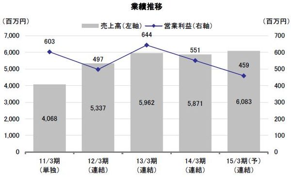 2015年3月期の営業利益は459百万円(前期比16.6%減)と2期連続の減益予想となっている。この要因は前述のようにマーケティング事業における先行投資によるものだ。現時点の主力事業のシステム事業においては流通額にリンクしたコミッション収入による増収増益という流れが確立しつつあり、実質的な収益力は改善基調にあると弊社では評価している。今期の減益決算は、一旦は株価に織り込まれたものと考えられ、今後、マーケティング事業の進捗状況が明らかになってくれば、同社の株価バリュエーションの再評価がなされてくると弊社ではみている。