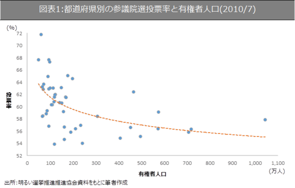 次の国政選挙は衆議院の解散がない限り、2016年7月の参議院選挙になります。以前から気になっていたので、図表1にあるように有権者人口と投票率の関係を、「公益財団法人 明るい選挙推進協会」の資料から2010年7月の参議院選挙を例に都道府県で見てみました。結果は驚くことではありませんが、やはり傾向的に有権者人口が少ない県ほど投票率が高いといえそうです。特に、有権者人口が300万人未満、首都圏をはじめとする大都市圏以外のいわゆる地方では、有権者人口が少なくなるほど近似線の変化が大きくなっています。人口が少ない地域では、どのような人々が投票率を押し上げているのでしょうか? 答えは驚くものではありません。