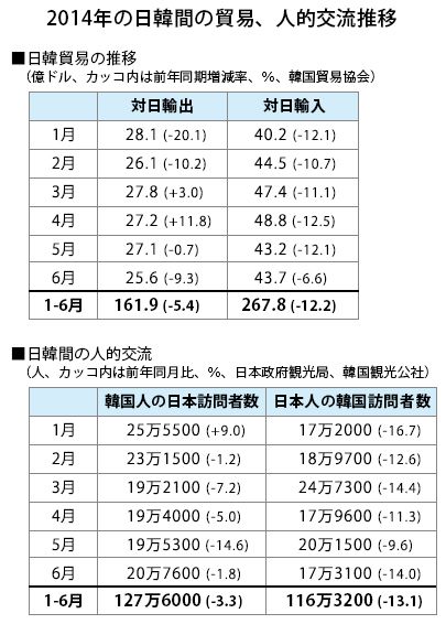 2014年の1月から6月まで、韓国を訪問する日本人数はずっと前年同月実績を下回った。1~6月の訪問者数は116万3200人で前年同期比13.1%減だった。7月の日本人訪問者数も17%減。1~7月の累計でも、13.7%減の133万6000人だった。