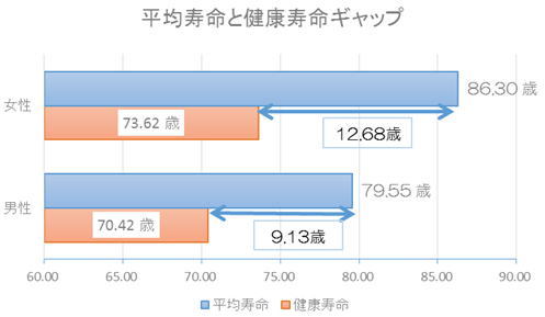 上記のグラフは、平均寿命と健康寿命のギャップを示したものです。女性の方が長寿であることはよく知られていますが、平均寿命と健康寿命のギャップは女性が12.68歳、男性では9.13歳と約10歳のギャップが男女ともに存在しています。