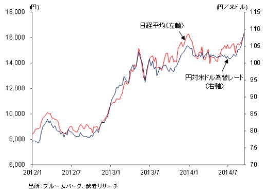 先週末(9月21日)ドル/円相場は109円/ドル、日本株式相場(日経平均株価)は1万6321円と、ともにリーマン・ショック後の高値を更新した。ドル/円は100~105円、日経平均株価は1万4000~1万6000円と1年間の膠着状態が続いたが、ともにレンジを上抜けたのであるから、新たなトレンドが始まったと見るべきであろう。