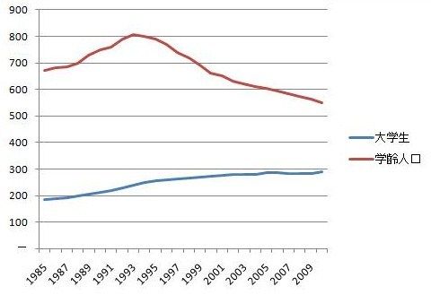 85年から2010年までの25年間に、大学の数は460から778に増え、学生数は下の図のように185万人から289万人へと56%も増えた(学校基本調査)。