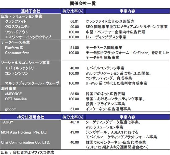 同社は1993年創業のeマーケティング専業会社。インターネット広告代理店として大手の一角を占めている。M&Aにも積極的で、創業以来国内外のeマーケティング関連会社に出資、一部は子会社化している。事業セグメントは、広告・ソリューション事業、データベース事業、ソーシャル&コンシューマ事業、海外事業に加えて、2013年12月期より新たに投資育成事業が加わった。