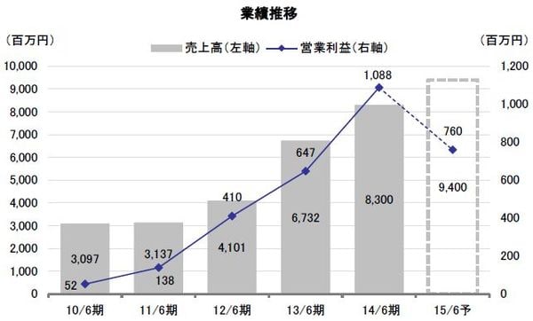 一方、2015年6月期の連結業績は売上高が9,400百万円、前期比13.2%増となる反面、営業利益は同30.2%減の760百万円を見込む。売上高については人的リソースの不足による未達リスクを考慮していることに加え、例えばM&Aによる外部からの成長取り込みなどの不確定な要素を排除した保守的な予想となっている模様。一方、同社は当期を来期以降の成長に向けた投資の時期として位置付けており、人財投資や新製品の開発投資、社内情報インフラ投資などを積極的に行っていくために減益を予想している。