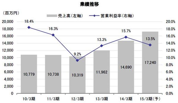 2015年3月期の業績予想は、売上高が前期比17.4%増の17,240百万円、営業利益が同1.2%増の2,328百万円と、増収増益が見込まれている。消費税増税の影響などで、売上高の伸び率は前期に比べてやや鈍化する見通し。また、利益面でも、2014年4月より開始した家具・インテリアECサービス「HOME'S Style Market」による原価率の上昇のほか、デジタルマーケティングの強化や不動産情報領域での新規サービスの開始、加盟店新規開拓などへの先行投資や前期の期ずれにより、利益率は若干低下する見込みとなっている。なお、同社は、2015年3月期を長期的な成長に向けた投資の時期と位置付けている。