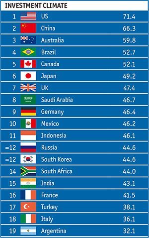 投資環境のカテゴリーでは、消費者主導の経済、ICT投資の水準、そして新規事業に適した環境に基づき、米国が1位の座を獲得した。これらの分野での強みが、政治的、マクロ経済的安定性の弱みを補い、首位につけた格好だ。