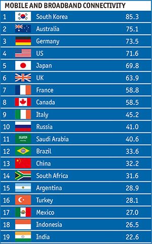 インターネット環境のカテゴリーでは、モバイルおよびブロードバンドのインターネットの手軽さと普及率のレベル、BtoBおよびBtoCのインターネット利用度、そして投資に対する通信セクターの開放性を測っている。