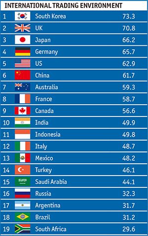 国際貿易の環境のカテゴリーは、各国経済がオープンで手軽な貿易を推進している度合いを測っている。部分的には、これは税関の効率性と全体的な物理インフラによって測定されている。