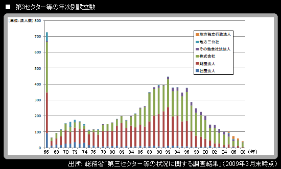 総務省の「第三セクター等の状況に関する調査結果」(2009年3月末時点)によると、第三セクターの数はバブル景気とともに1988年ごろから急増し、92年には467法人も設立された。2003年の1万111法人から減少傾向にあるものの、今なお8729法人を数える。また、自治体の出資額は全体の67%に相当する4兆2515億円に達し、残り2兆1362億円を民間が拠出している。