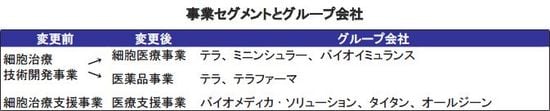 同社の事業セグメントは「バクセル®」の薬事承認取得に向けた開発活動を本格化したことに伴って、2014年12月期より表のとおり細胞医療事業、医薬品事業、医療支援事業の3つに区分変更している。