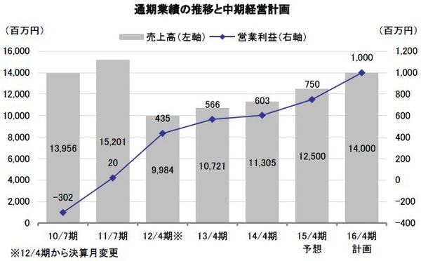 中期経営計画の最終年度となる2016年4月期には売上高14,000百万円、営業利益1,000百万円の達成を目指す。先行投資してきた「AdMatrix®」シリーズが収穫期に入り、業績のけん引役になるものとみられる。また、海外展開では中国に加えて、東南アジアへの進出を睨んでおり、今後の展開が注目される。