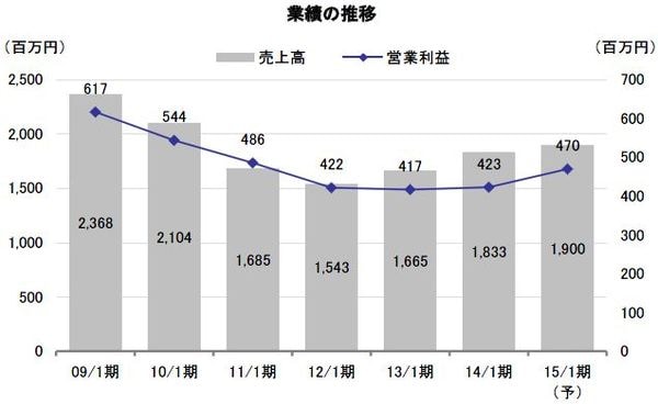 2015年1月期は売上高が前期比3.6%増の1,900百万円、営業利益が同11.0%増の470百万円と増収増益を見込んでいる。システムソリューション事業は第3四半期以降も低迷が続くが、「まかせてネット」の契約店舗数増加により、ASP事業の一段の成長を見込んでいる。2016年1月期以降は新サービス「まかせてタッチ」の収益貢献も期待され、業績の拡大基調が続く見通しである。