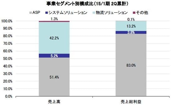 同社の事業は、ASP事業※、システムソリューション事業、物流ソリューション事業、その他事業という4つの事業セグメントに区分されている。2015年1月期の第2四半期累計期間(2014年2-7月)における事業セグメント別の構成比はグラフのとおりで、ASP事業が売上高の51.4%、総利益の83.0%を占める収益柱となっている。各事業の内容については以下のとおり。