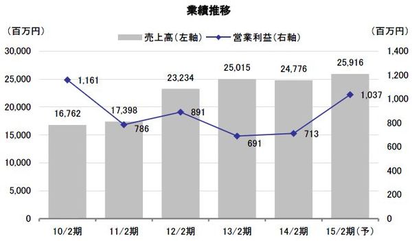 2014年2月期はブランド集約及び統合により売上高が前期比1.0%減の減収となったものの、原価低減や販管費の圧縮により営業利益で同3.2%増の増益を確保した。2015年2月期は、2014年2月期に集約した高収益ブランドの出店拡大やM&Aによる海外展開などにより、売上高が前期比4.6%増の25,916百万円、営業利益が同45.4%増の1,037百万円と増収増益を見込んでいる。特に、売上高は過去最高を更新する見通しである。なお、2015年2月期の第2四半期(2014年3月-8月期)累計決算は、既存店売上高が想定以上に好調であったことから、売上高が前年同期比2.7%増の12,699百万円、営業利益が同101.9%増の551百万円と2度の増額修正を伴いながら、期初予想を上回る増収増益を実現しており順調な進捗を見せている。
