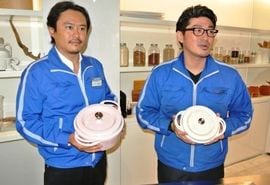 鋳物ホーロー鍋「バーミキュラ」を手にする愛知ドビーの土方邦裕社長(左)と智晴副社長