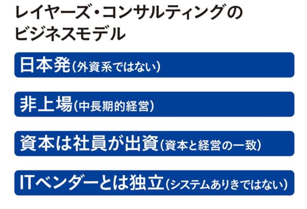 特徴は、同社自身が日本発の独立系コンサルティング会社であることだ。資本はすべて社員による出資で構成されており、非上場。特定のITベンダーなどとの資本関係がないため、経営の独立性が保たれている。この結果、短期的な利益や特定企業との利害関係に左右されることなく、中長期的な視点で真に顧客の企業価値向上に向けたサービスの提供が可能となる。つまり、みずからの決断に従い、顧客を第一に据えた行動を実践することで、顧客との長期的信頼関係を築くことができるというわけだ。
