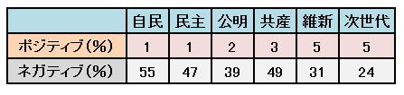 (表の数字は、各党の名前が含まれるツイッター、Facebookへの投稿のうち、Yahooリアルタイム検索の「感情の割合」で用いられているポジティブ・ネガティブ各々の文言が含まれている投稿の割合を示している。含まれていない場合は対象としてピックアップされない。)