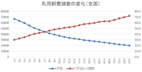 上のグラフは、乳用牛の飼養動向を示したものですが、酪農家の戸数は減少をたどる一方です。一方、1戸あたり頭数はむしろ増える傾向を示しています。背景には、高齢化などで離農した農家からの乳用牛の吸収や、輸入飼料や資材の高騰のなかで規模の拡大によるコスト低減を目指したことなどがあると見られます。