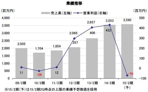 10月15日付で発表された2015年2月期の第2四半期累計(2014年3月-8月期)の業績は、売上高が前年同期比8.2%減の1,478百万円、営業損失が913百万円(前年同期は223百万円の黒字)と大幅な悪化となった。特定顧客向けのシステム開発案件において仕様変更の影響などにより開発スケジュールが大幅に遅延し、大規模な不採算プロジェクトになってしまったことが要因だ。同プロジェクトに関しては現在、開発スケジュールを仕切り直して顧客との交渉を進めている段階であり、当第2四半期では今後見込まれる最大限の費用を受注損失引当金(986百万円)として計上した。