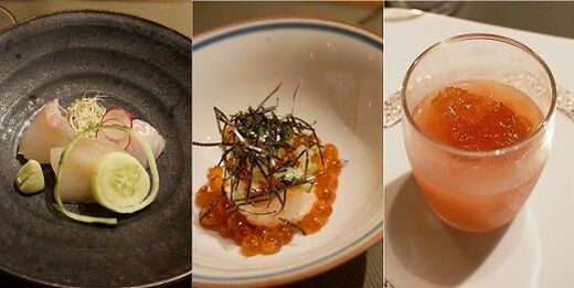 「串揚げだけでなく、ほかの料理も楽しんでほしい」と、コースには刺身や出汁をつかった料理を盛り込んでいる(左:刺身、中:寿司、右:デザート)