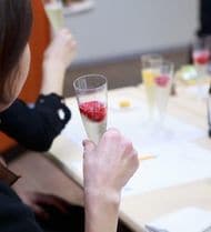 フルート型と呼ばれるグラスに真っ赤に熟した大ぶりのイチゴを一粒。そこにシュワシュワと泡立つスパークリングワインを注ぐと、会場のあちこちから「カワイイ!」「キレイ!」と楽しげな声が上がった。