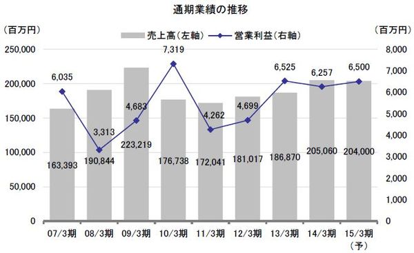 2015年3月期通期計画は、期初の想定どおり売上高204,000百万円(前年同期比0.5%減)、営業利益6,500百万円(前年同期比3.9%増)を見込む。下期(2014年10月-2015年3月期)は、大幅な円安が進行し、国内ミール(油糧)価格も下落傾向であり、2015年1月からの油価値上げで収益確保を図る。