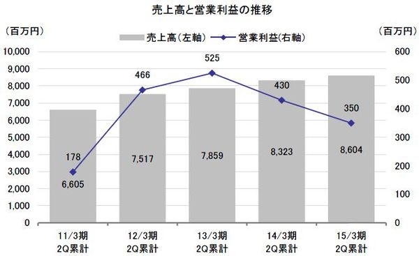 2015年3月期の第2四半期連結決算は、売上高が前期比3.4%増の8,604百万円、営業利益が同18.7%減の350百万円、経常利益が同23.1%減の343百万円、当期純利益が同47.1%減の211百万円となった。ただ、同社の期初予想に比べると、売上高で同1.2%、営業利益で同9.5%、経常利益で同7.4%、当期純利益で同5.7%の上振れとなった。上振れの要因は、想定以上の増収である。売上高は第2四半期としては過去最高を更新した。利益も増収効果によってかさ上げされた。