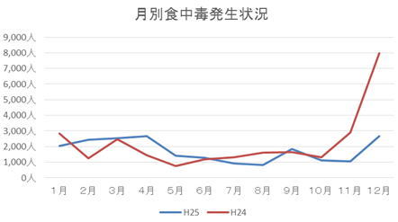 ここに興味深いデータがあります。厚生労働省が毎月発表している「食中毒」の月別発生状況です。平成24年と平成25年の1年間の発生人数をグラフにしてみました