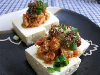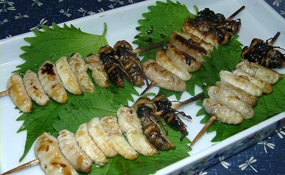 昆虫を用いた料理。上は豆腐にカマキリとカイコの蛹をトッピングしたもの、下はハチおよびハチノコの串焼き(写真提供:昆虫料理研究家の内山昭一氏)
