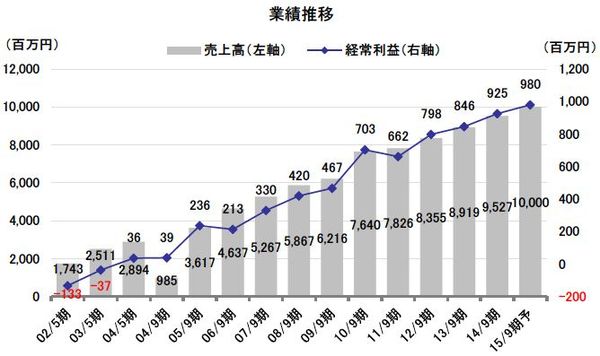 2015年9月期は売上高が前期比5.0%増の10,000百万円、経常利益が同5.9%増の980百万円と増収増益基調が続く見通し。新規出店は直営4店舗、FC3店舗を計画し、店舗改装も2店舗行う予定で、葬儀件数は前期比7.0%増を見込む。新規出店の拡大や内製化の推進による人件費増や広告宣伝費の増加が続くものの、増収効果でカバーする形となる。
