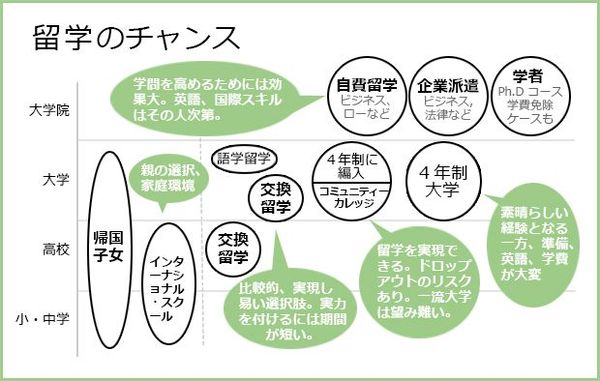 留学の機会を簡単に図にしてみました。高校や大学の短期留学、学部、大学院への留学など様々です。