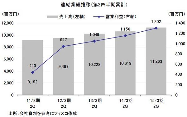 2015年3月期第2四半期累計(2014年4月-9月)の連結業績は、売上高が前年同期比6.1%増の11,263百万円、経常利益が同13.4%増の1,339百万円となり、4期連続で過去最高益を更新した。中堅・中小企業向け製品・サービスが、既存顧客の買い替え需要に加え、新規顧客開拓に注力した効果により、前年同期比2ケタ増収と業績をけん引した。また、新製品投入までの端境期となっている会計事務所向けも前年同期並みの水準と底堅く推移した。