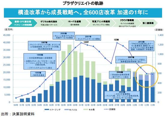 プリント事業(従来の「イメージング事業」から名称変更)は直営及びフランチャイズ(FC)でプリントショップ「パレットプラザ」「55ステーション」を展開する事業である。この事業はかつて「55ステーション」を子会社化した2006年を直近のピークに、店舗数、売上高とも減少基調をたどってきた。その減少トレンドに下げ止まりの手応えが感じられたのが2014年3月期であった。