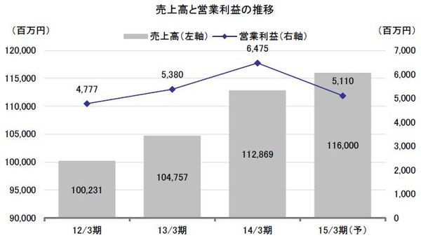 2015年3月通期の業績見通しは、売上高116,000百万円(前年比2.8%増)、営業利益5,110百万円(同21.1%減)、経常利益5,140百万円(同23.3%減)、当期純利益2,980百万円(同20.3%減)が予想されている。上半期の結果を受けて、期初予想からは下方修正されたが、かなり厳しい見方をしていることから、これ以上の下振れはなさそうだ。