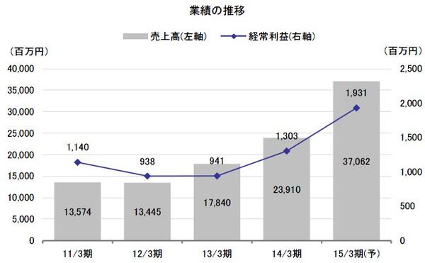 2015年3月期の第2四半期累計決算は、売上高18,411百万円(前年同期比101.0%増)、営業利益78百万円(前年同期は670百万円の営業損失)、経常損失15百万円(同394百万円の経常損失)、四半期純利益221百万円(前年同期比84.8%減)となった。計画対比では、売上高で889百万円、営業利益で653百万円、それぞれ上振れとなった。2015年3月期下期においては、この上期の上振れ分を2016年3月期に向けた広告宣伝活動に投下する可能性があるため、単純に上方修正期待とは言い難い面はあるが、現在の会社予想を下回るリスクは極めて小さくなったと言えよう。